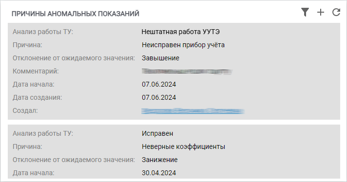 Виджет позволяет выводить причины аномальных показаний на ТУ (рис. 1) и может быть добавлен на форму точки учёта.