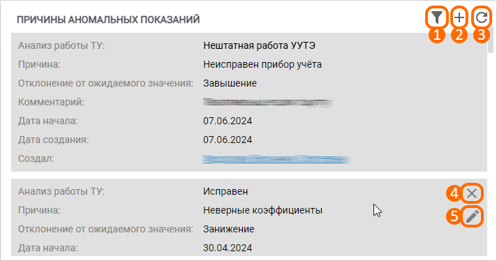 Опция фильтрации (рис. 3, элемент 1) позволяет отфильтровать список причин аномальных показаний по различным критериям (причина/период создания записей о причинах аномальных показаний);