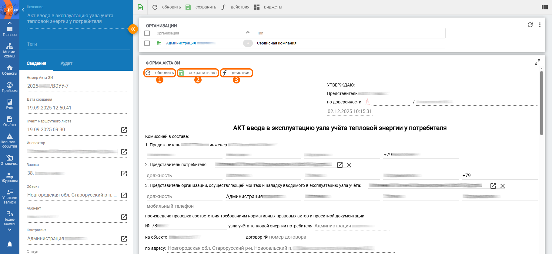 При создании акта ЭИ большинство параметров будет заполнено автоматически на основании данных, указанных в АИИС для связанных записей (объекта, точки учёта и др.).