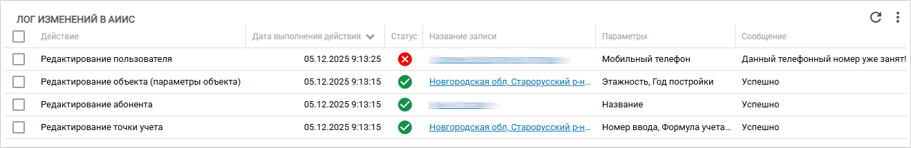 Рисунок 21 – Виджет «Лог изменений в АИИС»