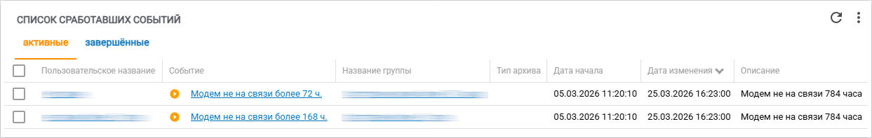 Виджет позволяет отобразить список сработавших событий по модему (рис. 10). Переход между списками (активных и завершенных) событий выполняется при помощи панели вкладок в левой верхней части виджета. Стоит отметить, что в списке завершенных событий предусмотрена фильтрация по году и месяцу, события за которые необходимо отобразить на виджете. Ознакомиться с информацией по работе с функционалом групп событий можно в статье «Группы пользовательских событий». Также имеется описание всех пользовательских событий модема.