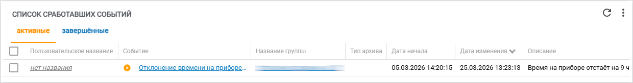 Виджет позволяет отобразить список сработавших событий по прибору учёта/регулятору (рис. 9). Переход между списками (активных и завершенных) событий выполняется при помощи панели вкладок в левой верхней части виджета. Стоит отметить, что в списке завершенных событий предусмотрена фильтрация по году и месяцу, события за которые необходимо отобразить на виджете. Ознакомиться с информацией по работе с функционалом групп событий можно в статье «Группы пользовательских событий». Также имеется описание всех пользовательских событий прибора учёта/регулятора.