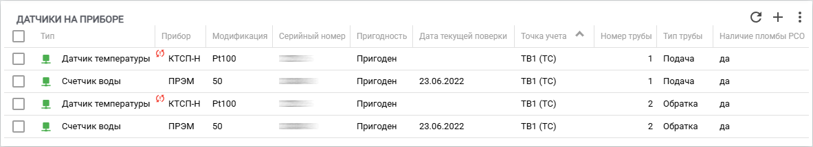 Виджет позволяет отобразить датчики на приборе учёта/регуляторе (рис. 6). Ознакомиться с подробной информацией по работе с датчиками на ПУ/регуляторе можно в отдельной статье.