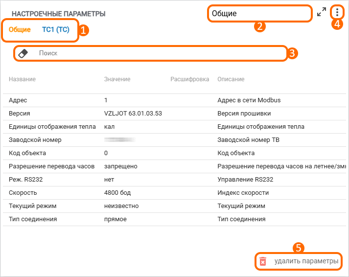 Поле для поиска (рис. 3, элемент 3) позволяет ввести полное/частичное наименование искомого параметра. Для быстрой очистки поля поиска используется кнопка в левой части строки;