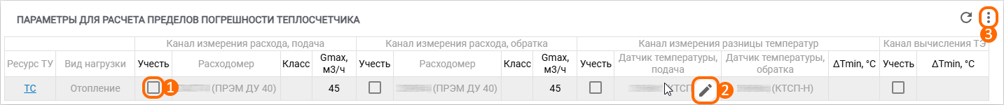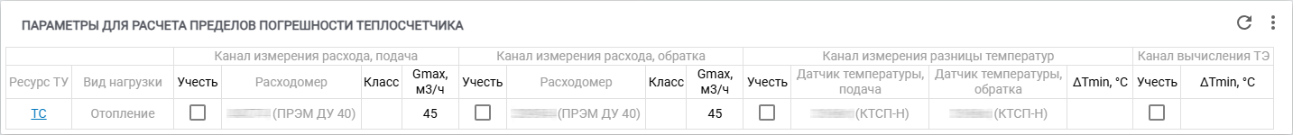 Виджет «Параметры для расчета пределов погрешности теплосчетчика»