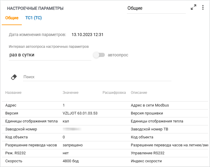 Виджет позволяет просмотреть и контролировать настроечные параметры прибора учёта или регулятора, считываемые из вычислителя (рис. 2).
