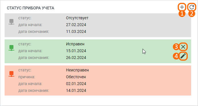 Кнопка редактирования статуса (рис. 5, элемент 4) позволяет изменить параметры записи о статусе прибора учёта. Для отображения данной опции необходимо навести указатель мыши на ячейку с информацией о статусе ПУ.