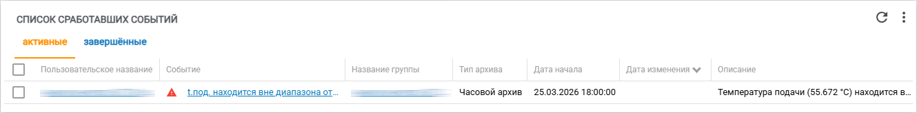 Виджет позволяет отобразить список сработавших событий по точке учёта/контуру (рис. 41). Переход между списками (активных и завершенных) событий выполняется при помощи панели вкладок в левой верхней части виджета. Стоит отметить, что в списке завершенных событий предусмотрена фильтрация по году и месяцу, события за которые необходимо отобразить на виджете. Ознакомиться с информацией по работе с функционалом групп событий можно в статье «Группы пользовательских событий». Также имеется описание всех пользовательских событий точки учёта/контура.